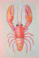 Speelse Kreeft Kunst - Dit kreeft schilderij toont een levendige, roze kreeft met lange antennes en scherpe scharen tegen een zacht pastelblauwe achtergrond versierd met gele stippen, waardoor het geheel een speelse en kleurrijke uitstraling krijgt.