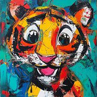 Een vrolijk portret van een tijger met grote ogen en een open glimlach. De expressieve verfstreken en felle kleuren maken dit werk levendig en speels. Een opvallende blikvanger die direct energie en warmte brengt in elke ruimte.