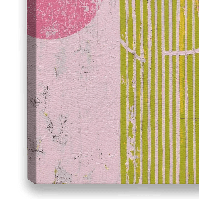 Dit abstracte schilderij combineert roze en limoengroen in een minimalistische compositie van lijnen en eenvoudige, grote vormen. Gebogen en gedeconstrueerde elementen wisselen elkaar af, terwijl roze cirkels en gele strepen ritme en dynamiek toevoegen. De verticale opbouw en de roze achtergrond zorgen voor een moderne, frisse…