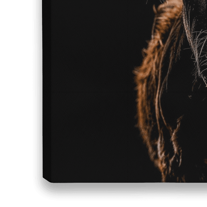 De uitgestoken tong voegt een vleugje speelsheid toe aan de compositie en geeft het beeld een gevoel van vrijheid en luchthartigheid. De diepe, donkere ogen die recht in de camera kijken, zijn doordrongen van een wijsheid en kalmte die het beeld een bijna menselijke persoonlijkheid geven. De diepzwarte omgeving benadrukt het onderwerp en creëert een intimiteit die de kijker direct in het moment trekt.