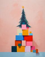 Speelse en kleurrijke abstracte kerstboom. Voor wie eens iets anders wil, ook heel leuk als alternatief voor een boom. Pastelkleurige pakjes zijn opgestapeld in de vorm van een kerstboom. Daarbovenop prijkt een kerstboom als piek. Een werk met een knipoog!