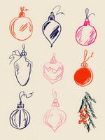 Dit kunstwerk toont een verzameling handgetekende kerstballen in verschillende vormen en kleuren. Elke bal is eenvoudig geschetst met losse lijnen in rood, roze en blauw, waardoor een speelse en moderne uitstraling ontstaat. De variatie in vormen – van rond tot druppelvormig en hoekig – laat zien hoe veelzijdig de kerstdecoratie kan zijn.