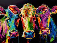 Dit levendige schilderij vangt de vrolijkheid van het platteland met een speelse weergave van kleurrijke koeien. De levendige kleuren spatten van het canvas en creëren een opgewekte sfeer. De koeien, elk met hun eigen unieke kleurenpatroon, kijken nieuwsgierig en speels in de lens.