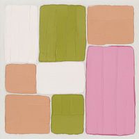 Speelse en gestructureerde compositie van rechthoekige kleurvlakken, die in een zorgvuldig evenwicht naast en boven elkaar geplaatst zijn. De zachte aardetinten van terracotta en beige worden afgewisseld met frisse groene accenten en een opvallend roze vlak dat direct de blik vangt. Daarnaast zorgen de witte vlakken voor lucht en openheid binnen het geheel, waardoor de compositie niet zwaar maar juist licht en uitnodigend aanvoelt.