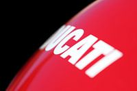 De brandstoftank van een rode Ducati Monster motor, met de onmiddellijk herkenbare belettering.