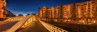 Historische oude stad van Hamburg in de Hafencity met mooie poortgebouwen en mooie verlichte brug. Stadspanorama 's avonds in het blauwe uur.