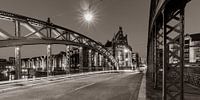 Zwart-wit foto van de Brooksbrug in de Speicherstadt in Hamburg, Duitsland