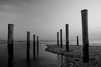 Kromme en rechte lijnen die elkaar ontmoeten in een kustlandschap van zand en water, waar de menselijke verstoringen worden grotendeels worden weggevaagd.
