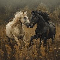 Twee contrasten in de wei, een schimmel een een zwart paard. Ze hebben lol met elkaar, dagen elkaar uit, rennen achter elkaar aan.