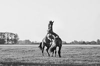 In Friesland zijn een stel paarden aan het spelen in de wei. De foto is zwart wit en gemaakt in Friesland. Het lijkt er soms ruig aan toe te gaan, maar paarden kunnen veel hebben.