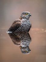 Tijdens het badderen is de sperwer af en to even stil om te observeren. Geeft een mooi rustig beeld met spiegeling.