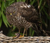 In een flits schiet een vrouwtjessperwer laag over de heg, haar bruine vleugels behendig manoeuvrerend tussen de struiken. Met een explosieve versnelling verrast ze een huismus bij de voederplank. Haar vlijmscherpe klauwen grijpen de prooi onverbiddelijk vast, waarna ze op een tuinstoel begint aan haar maaltijd. Ze plukt vakkundig de…
