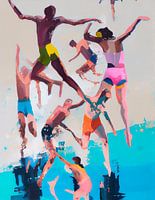 Dit schilderij is net als een dagje aan het strand, maar dan zonder al het zand tussen je tenen! Het toont een grof geschilderd tafereel van mensen die in badpakken in het water zwemmen en springen. Het lijkt erop dat de schilder zijn verfkwasten heeft laten stuiteren op het doek, maar het resultaat is spectaculair.
