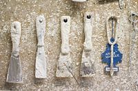 Een stilleven van een tafereeltje uit een werkplaats. Keurig aan de wand hangend, bespat en besmeurd, wachten de stukken gereedschap tot ze hun nut mogen bewijzen in de handen van een kundige gebruiker.