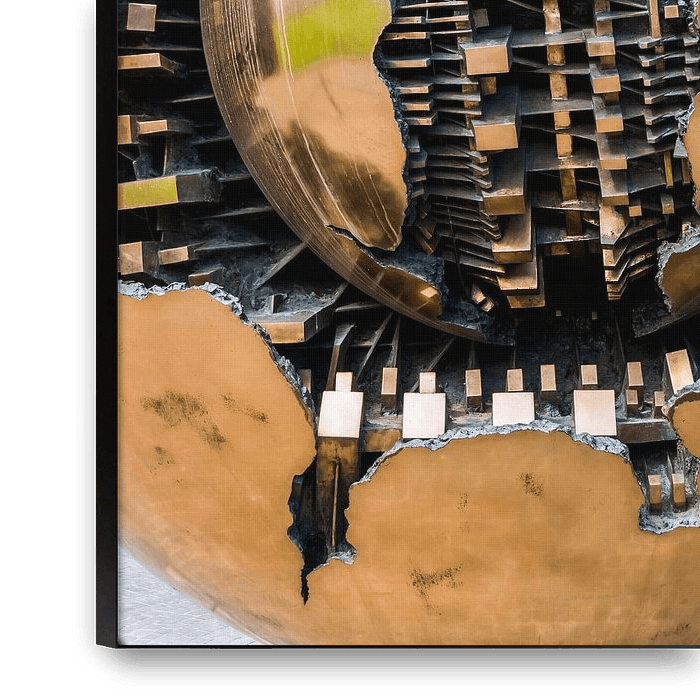 Deze bronzen sculptuur van Arnaldo Pomodoro staat op een plein in het Vaticaan te Rome. De close-up tegen een mooie blauwe hemel geeft een heel abstract beeld van dit kunstwerk.