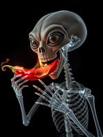 Humor en mysterie komen samen in dit opvallende kunstwerk waarin een buitenaards skelet, met een ondeugende glimlach, een vurige rode chilipeper consumeert. De vlammende gloed van de peper contrasteert krachtig met de donkere achtergrond en benadrukt de speelse surrealiteit van de scène. De griezelige maar charmante uitstraling van het skelet, gecombineerd met de levendige kleuren van de peper, creëert een beeld dat zowel fascinerend als hilarisch is.