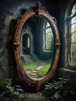 Een vervallen oud gebouw, een antieke spiegel met een sierlijke houten lijst. Of als je goed kijkt, is het misschien een portaal naar een andere wereld? Er loopt een pad door een groen grasveld dat leidt naar een deuropening.