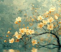 De bloemen, delicaat en gedetailleerd, stralen een pure en serene schoonheid uit, alsof ze zweven in een droomachtige staat. De achtergrond heeft een subtiele, textuurrijke afwerking…