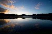 De horizon vernauwt zich tot een dunne schaduwlijn als de zon bijna onder is, verborgen achter de heuvels, maar nog steeds aanwezig in de zwakke gloed die over de richels strijkt: een gouden spoor dat blijft hangen op de wolken en het stille oppervlak.