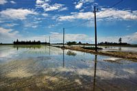 Rijstveld in het estuarium van de Spaanse rivier de Ebro weerspiegelt t wolkendek en electriciteitspalen