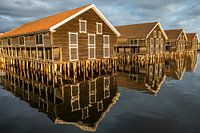 Oude pakhuizen op palen met reflectie in het water. Met mooi zweeds licht tegen het vallen van de avond.
