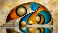 Het motief wordt verlevendigd door het lichte wateroppervlak aan de onderrand van de afbeelding. Het weerspiegelt de kleurrijke compositie en vermenigvuldigt zijn kleuraccenten in zachte reflecties. De treden lijken elegant gebogen en geven het tafereel een bijna theatrale dynamiek. Op de muur zijn nog meer ronde vormen in subtiele pastelkleuren te zien, die de achtergrond verdichten tot een fascinerende textuur. Ondanks de felle kleuren en de grote bollen is er een kalmerend evenwicht in de hele foto. De gekozen tinten lijken met elkaar te harmoniëren en creëren een warme, bijna sensuele sfeer. Architectonische strengheid en organische zachtheid vormen hier een harmonieuze eenheid. De gestapelde vormen nodigen de blik van de kijker uit om tussen de verschillende niveaus te dwalen. Dit creëert het gevoel een droomwereld te betreden waarin sferen, treden en kleuren op een nieuwe manier samenkomen.