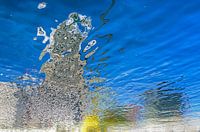 Een reflectie in het water van de Wijnhaven in Rotterdam. Het geel van de watertaxisteiger, het blauw van de lucht en de grijstinten van de gebouwen vloeien samen tot een abstract schilderij.