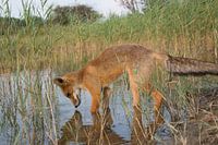 Jong vosje wat van alles ziet in het water.