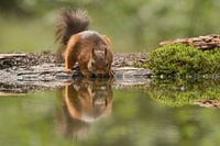 Dorstige eekhoorn vastgelegd met spiegelbeeld.