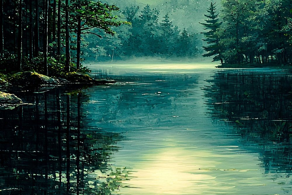 Dit prachtige ontwerp toont een serene en tijdloze weergave van een spiegelend meer omgeven door een weelderig bos. De sfeervolle lichtinval creëert een rustige en ontspannende ambiance, perfect voor liefhebbers van natuur en rust. De zachte kleuren en het gedetailleerde realisme maken dit kunstwerk een uitstekende keuze voor elke ruimte, van woonkamer tot eetkamer. Laat je inspireren door de kalmte en natuurlijke schoonheid van dit ontwerp.