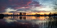 Nederlands winterlandschap met spiegelende zonsondergang.