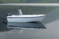 Spiegelglad water met Sandström Classic 495 open motorboot op een meertje in Noorwegen