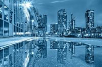 Een monochroom sfeerbeeld in koel blauw gemaakt bij de Leuvehaven in Rotterdam. De kranen en historische schepen van het maritiem buitenmuseum en de torens van de binnenstad spiegeling in een plas op het rauwe beton van de kade. Er bestaat ook een kleurenversie, die is elders in de shop te vinden.