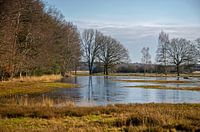 Is het een plas, is het een ven, is het een meertje? In ieder geval is deze waterpartij in nationaal park Dwingelderveld in Drenthe bedekt met een dun laagje ijs. Dat zorgt voor een mooie, gebroken spiegeling van de wolken, de blauwe lucht, het bos en de vrijstaande bomen. Het licht van de laagstaande zon zorgt op deze koude januaridag…