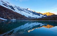 De Simonyspitze en Dreiherrnspitze worden weerspiegeld in het ijsmeer in het Krimml Achental