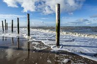 Gemaakt bij het Palendorp in Petten. Mooie spiegeling van de palen en de wolken in de golven die zich terug trekken.