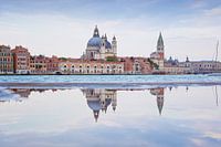 Uitzicht op de wijken Dorsoduro en San Marco in Venetië, gezien vanaf het eiland Giudecca in het zuiden. Op de kade van dat eiland lag een plas water die heel mooi de gebouwen aan de overkant reflecteerde. Door de camera nagenoeg op de grond te plaatsen, kon ik de spiegeling vastleggen.