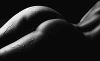 In dit beeld zien we het lichaam als een landschap, zorgvuldig vastgelegd in zwart-wit. Het licht glijdt over de huid en legt de glooiende vormen bloot alsof het marmer betreft dat door een beeldhouwer is gepolijst. De waterdruppels versterken dat effect: ze vormen een glinsterend netwerk van lijnen die langs de rondingen naar beneden…