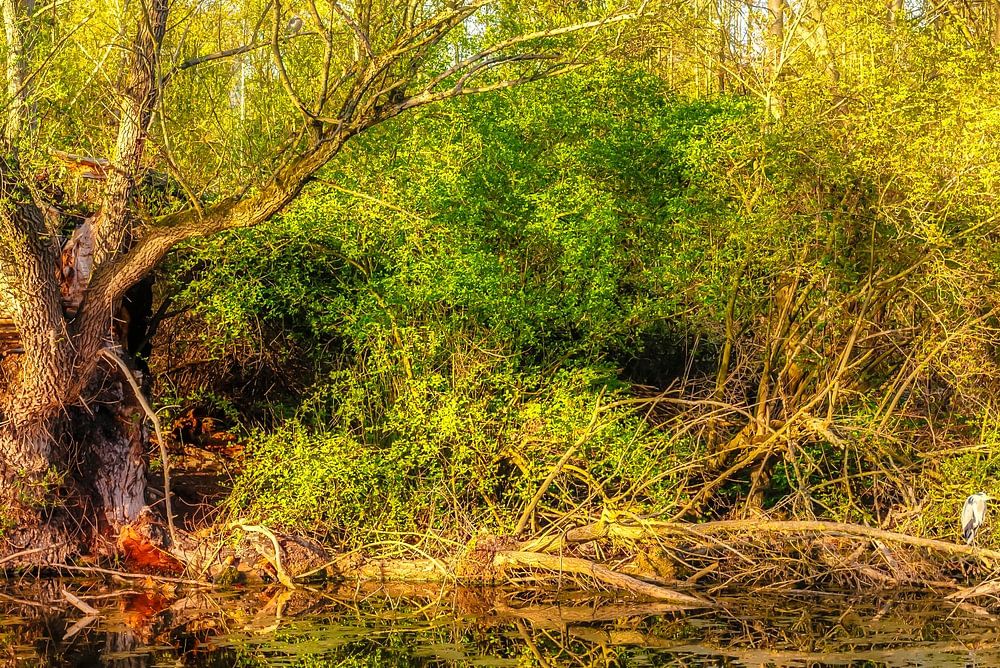 Spiegeling van bomen in een vijver met blauwe reiger in de lente