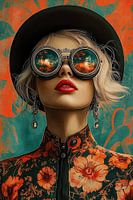 Een stijlvolle artistieke compositie waar vintage en modern samensmelten in een explosief kleurenspel van turquoise en oranje. De steampunk-geïnspireerde bril reflecteert een dromerige hemel, terwijl de elegante hoed en bloemen-print jurk een tijdloze elegantie uitstralen. De rode lippen vormen een krachtig accent in deze surrealistisch aandoende digitale kunstcreatie.
