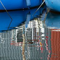 Kleine vissersbootjes vormen een kleurrijk schouwspel terwijl ze veilig in de haven liggen in afwachting van de eerste najaarsstorm. De wind maakt van de spiegeling een grillig en abstract beeld.