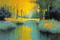 Spiegeling - Dit werk vangt een plotselinge zonvlaag die het landschap verandert in een gouden theater. Als eerste valt de gele kroon van bomen op: een bijna fluorescerende band van licht die het midden- en achtergrondvlak domineert. De stammen zijn slank, bijna grafisch zwart tegen de geelheid; ze vormen een ritme van stroken dat het…