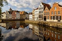 De Spiegelrei in Brugge is een van de vele pittoreske grachten die door deze Unesco Werelderfgoed stad lopen. Deze foto is in de ochtend genomen voordat de wind en de rondvaartboten de spiegeling in het water bederft.