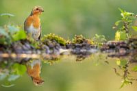 Roodborst bekijkt zijn spiegelbeeld aan de vijver van mijn tuin. Wat een ijdeltuit ;-) Geweldig hoe haar blik is.