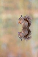 Deze eekhoorn is via een zandbank een vijver ingelopen om op zoek te gaan naar noten die in het water zijn gevallen. Zoals je ziet is de eekhoorn hier succesvol geweest en geniet op zijn dooie gemak van het lekkere hapje. Doordat de eekhoorn stil zit, is het water helemaal vlak en ontstaat er een zuivere reflectie.