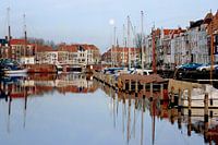 Beeld in kleur van de Rouaanse Kaai Middelburg met de Spijkerbrug op de achtergrond.