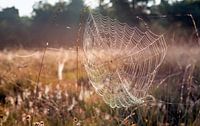 Close-up van een bedauwd spinnenweb met een spin in het centrum. Het web is aangebracht tussen grashalmen. De foto is op een vroege zomerochtend gemaakt op de Strijbeekse Heide, een natuurgebied ten zuiden van Breda in Noord-Brabant.
