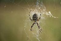 Close-up van een tijgerspin/wespspin in het web. Het gestreepte patroon van de tijgerspin is duidelijk zichtbaar.