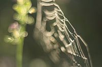 Dauwdruppels in het spinnenweb. Het zonlicht tovert het water om tot mooi glinsterende bokeh vlekjes.
