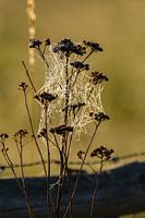 Heel vroeg net na zonsopkomst verlichtte het zonnetje dit spinnenweb waar de druppeltjes nog aan zaten.